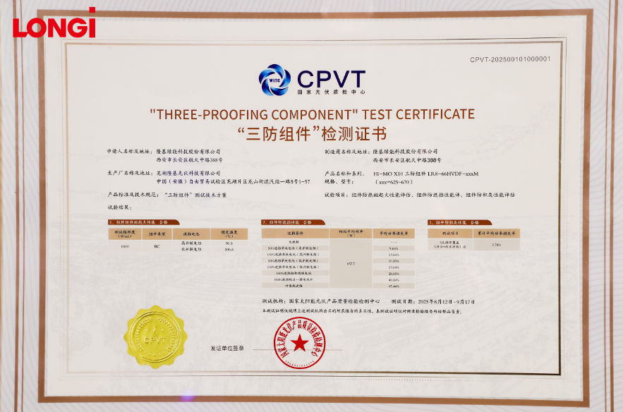 同时,组件创新性采用防积灰边框设计,通过结构优化实现雨水自清洁,既降低了热斑发生概率,又减轻了后期运维负担,成为工商业屋顶光伏电站的理想选择。更值得关注的是,隆基 “三防组件” 是全球唯一获得 CPVT(国家光伏质检中心)“三防组件” 检测证书的产品,这一认证标志着其安全性能达到行业顶尖水平。