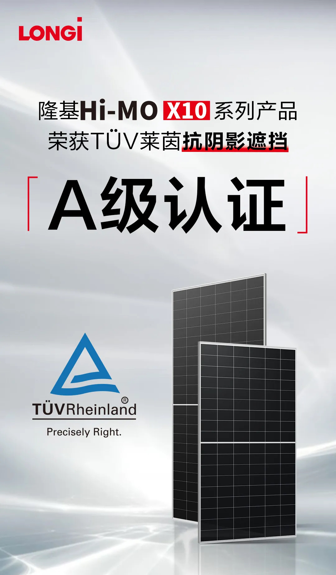凭借出色的 “防遮挡” 性能,Hi-MO X10“三防组件”已获得 TÜV 莱茵抗阴影遮挡 A 级认证。
