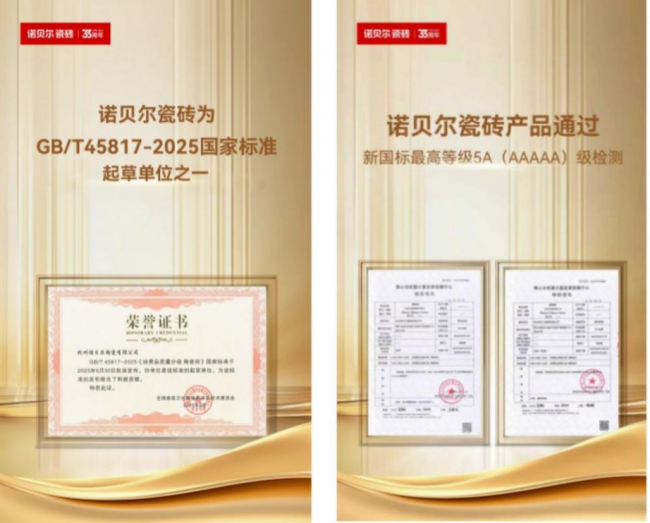 诺贝尔瓷砖凭借卓越的产品品质与技术创新,持续获得国家及行业的高度认可。企业不仅作为GB/T45817-2025《消费品质量分级陶瓷砖》与GB/T25471-2023《绿色建筑用瓷砖》的国家标准起草单位之一,产品率先通过新国标最高等级——5A级认证,多款产品获权威检测认可。在技术层面,其自研的“多径彩饰系统技术”突破材料局限,赋予岩板更高强度与更丰富的装饰表现。