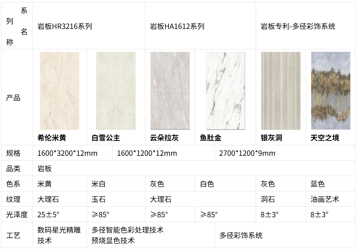 核心产品类型:聚焦岩板核心品类,支持3-20mm全厚度、1200x3600mm大规格定制。涵盖亮光、哑光、精雕等多种工艺,可实现连纹无限拼接。